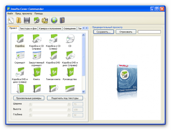 Insofta CoverCommander 3.1.1 позволяет создавать профессиональные виртуальные коробки, книги, DVD-коробки, руководства, CD-диски, скриншоты. Всего несколько щелчков мыши все что нужно для выполнения этой работы. Исчерпывающие настройки освещения, камеры, тени, отражения позволяют вам создать изображение любого уровня сложности и увидеть готовый результат в реальном времени в окне предпросмотра. Мастер создания нового проекта выполнит всю "грязную" работу за вас, так что вы сможете сосредоточиться на содержании вашего проекта.