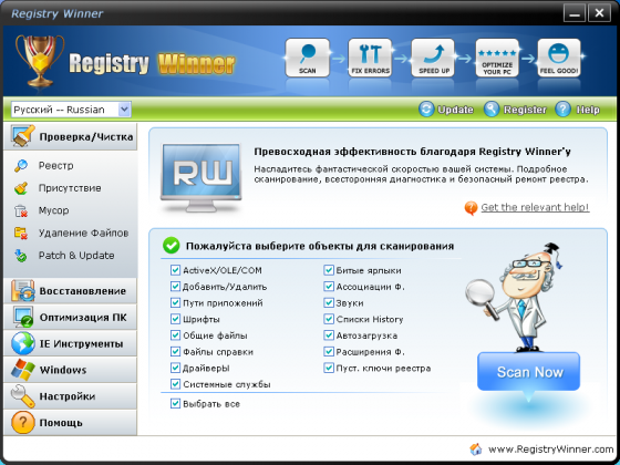 Registry Winner – программа для улучшения работы компьютера, которая находит ошибки, оптимизирует систему и ускоряет ее. Вы можете столкнуться с различными проблемами, которые постепенно появляются с использованием компьютера, например, замедление, зависание, «голубой экран смерти», постоянные сообщения об ошибках и т.д. Registry Winner использует только самые продвинутые технологии для сканирования ваших жестких дисков и дает вам наиболее полную диагностику всего за несколько секунд. Как только проблемы обнаружены приложением, Registry Winner предложит вам профессиональное и высокоэффективное решение для вашего компьютера. С использованием Registry Winner на регулярной основе ваша система будет поразительно стабильна. Registry Winner сканирует весь компьютер на возможные ошибки, которые ведут к проблемам в реестре. Происхождение у них может быть разное, но для программы это не имеет значения – она справиться со всем легко и быстро.