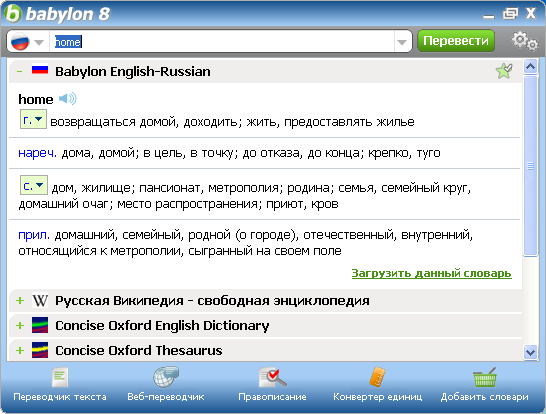 Babylon 8 - словарь, позволяющий переводить слова с одного языка на другой. Работать со словарем очень просто: после нажатия кнопкой мыши на интересующее слово появляется окно с его переводом. Кроме перевода слов, программа включает в себя английские тематические и толковые словари, а также имеет функции конвертации валют на текущую дату и перевода мер из одной системы в другую. Англо-русско-английский и другие словари можно закачать дополнительно с сайта разработчика. Кроме словаря, который можно использовать в любое время, при онлайн-работе, Babylon позволяет воспользоваться огромными базами данных, сосредоточенными в таких глоссариях, как Britannica, Amazon, Accuweather и другие. Теперь вам не потребуется много времени на исправление орфографических ошибок и на поиск правильного слова или перевода. С данной программой читать и писать на всех языках гораздо проще, быстрее и эффективнее. Программа делает всю работу за вас, при помощи проверки орфографических ошибок в реальном времени, умного переводчика на любой язык и с любого языка, а также автоматического подбора выражений.