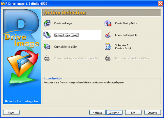 R-Drive Image является эффективной утилитой для создания файлов образа диска и резервного копирования данных. Файл образа диска, содержащий точную, "байт в байт" копию жесткого диска, раздела или логического диска, может быть создан без перезагрузки компьютера и с различным уровнем сжатия данных. Созданный образ диска может быть сохранен на носителях различного вида, включая такие съемные носители, как CD-R(W)/DVD, Iomega Zip и Jazz диски. R-Drive Image это одна из лучших утилит резервного копирования и восстановления данных для предотвращения их катастрофической потери после непоправимых сбоев операционной системы или аппаратной части.