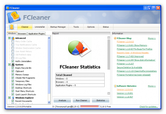 FCleaner - комплексный пакет для очистки и оптимизации системы. Производит удаление временных файлов, историю посещений web-страниц, файлы-cookies, сохранённый кеш (поддерживаются все браузеры), очищает корзину, очищает историю работы многих приложений (Windows Media Player, Real Player, Quicktime Player, SWiSH, Paint Shop Pro, Adobe Flash Player, Axialis IconWorkshop, Media Player Classic, VirtualDub и другие), анализирует установленные программы и может корректно их деинсталироваить, поддерживается корректировка автозагрузки идругие функции.