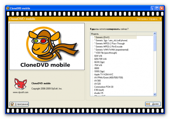 CloneDVD Mobile -превращает ваши фильмы в формате DVD быстро и качественно в формат, который ваше мобильное оборудование (Sony PSP, Apple iPod Video, iAudio X5, Creative Labs ZEN Vision, etc) с легкостью может воспроизвести. Вы можете также превратить свой DVD в другие форматы, например DivX, XviD, Avi, MP4, и т.п. С CloneDVD Mobile вы можете поместить свои любимые фильмы или TV-сериалы на вашем мобильном видеооборудовании и смотреть их где и когда захотите!