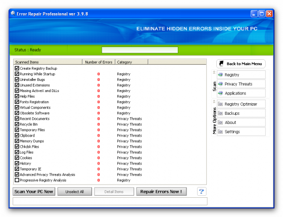 Error Repair Professional - программа найдет неполадки в реестре, библиотеках данных системы и приложений, а также серьезные ошибки, допущенные пользователем, ставящие безопасность системы под угрозу. Ошибки в операционной системе могут привести ко многим неприятностям. Избежать их можно только одним способом — вовремя обнаружить и исправить. И то и другое поможет сделать данная программа. Сохранит ваш ПК, работающим без проблем. При помощи этой программы вы можете просканировать систему, идентифицировать, очистить и восстановить ошибки одним кликом мыши. Пошагово утилита просмотрит ваш реестр на предмет любых недействительных записей и представит вам список найденных ошибок реестра.