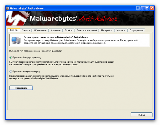 Malwarebytes Anti-Malware - новая версия программы от создателей RogueRemover Pro, AboutBuster и других популярных утилит, способная находить и удалять разнообразные вредоносные программы. Программой используется эвристический метод сканирования, позволяющий в реальном времени контролировать безопасность всей системы. Также имеется возможность полного сканирования всех дисков. Помимо этого, в состав данной программы входят дополнительные утилиты, предназначенные для удаления вредоносных программ вручную. Обладает понятным пользовательским интерфейсом с многоязычной поддержкой, включая поддержку русского языка.