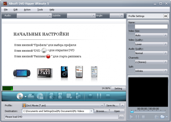 Xilisoft DVD Ripper Ultimate - мощная и удобная в использовании программа для копирования DVD-дисков с возможность конвертирования содержимого в соответствующие аудио и видео файлы типа AVI, MPEG, WMV, DivX, MP4, H.264, RM, MOV, M4V, XviD, 3GP, MP3, WMA, WAV, RA, M4A, AAC, AC3, OGG и т.д. Утилита способна создавать файлы, совместимые с iPod, iPhone, PSP, Apple TV и прочими портативными устройствами. Имеются опции конвертирования сегментов клипа, изменения размеров, наложения эффектов, добавления логотипов, предпросмотра результатов. Присутствует пакетная обработка файлов, получение информации из Интернет-баз и многие другие возможности.