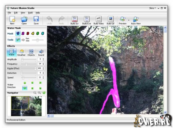 Nature Illusion Studio поможет Вам превратить обычные снимки в прекрасные анимированные пейзажи. Программа позволяет накладывать разные графические и звуковые эффекты, и затем конвертировать результат в экранную заставку, исполняемый файл, анимированный рисунок или видео-файл. Загружаете свою любимую фотку с пейзажем, выделяете с помощью масок области, которые нужно оживить (напр. поверхность водоема, ручей, водопад и т.д.), добавляете звук (шум прибоя, пение птиц, журчание воды), можно добавить падающий снег или дождь. Вобщем, теперь вы можете самостоятельно создавать скринсейверы профессионального качества, делать авторские анимированные GIF на основе ваших фото.