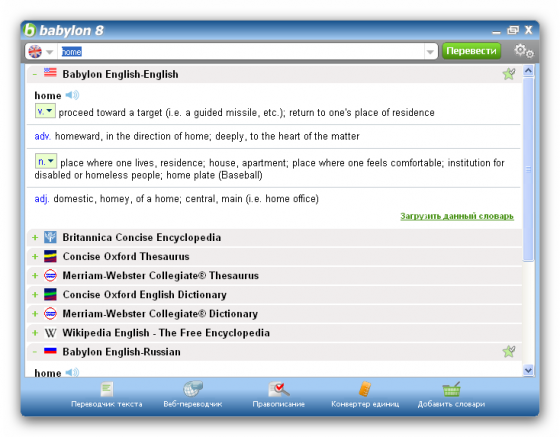Babylon 8 - словарь, позволяющий переводить слова с одного языка на другой. Работать со словарем очень просто - после нажатия кнопкой мыши на интересующее слово появляется окно с его переводом. Кроме перевода слов, программа включает в себя английские тематические и толковые словари, а также имеет функции конвертации валют на текущую дату и перевода мер из одной системы в другую. Англо-русско-английский и другие словари можно закачать дополнительно с сайта разработчика. Кроме словаря, который можно использовать в любое время, при онлайн-работе, Babylon позволяет воспользоваться огромными базами данных, сосредоточенными в таких глоссариях, как Britannica, Amazon, Accuweather и другие. Теперь вам не потребуется много времени на исправление орфографических ошибок и на поиск правильного слова или перевода. С данной программой читать и писать на всех языках гораздо проще, быстрее и эффективнее. Программа делает всю работу за вас, при помощи проверки орфографических ошибок в реальном времени, умного переводчика на любой язык и с любого языка, а также автоматического подбора выражений.