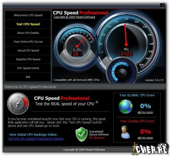 CPU Speed Professional - программа, которая может профессионально протестировать ваш Intel или AMD процессор на скорость, и выдать Вам результат о реальной скорости вашего центрального процессора (ЦП). Вы можете также отправить свой результат по скорости процессора в Мировой Рейтинг и сравнить Ваш компьютер с другими - во всем мире и в вашей собственной стране.