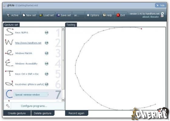 gMote – простая в использовании программа для распознавания жестов. Когда те или иные команды задаются не сочетанием клавиш, а простым движением мышки. Это удобно тем, кто работает исключительно с мышью, и при этом хотел бы делать это быстро и непринужденно, не наматывая лишнего пробега. Нажмите кнопку «Создать», укажите необходимое движение мыши в тестовом окне, а затем присвойте ему одно из 30 действий. Последние предусматривают команды для браузера, медиа-плеера и текстовых редакторов. Тем не менее, можно собственноручно указать ход выполнения работы, выбрать сайт и комбинацию горячих клавиш.