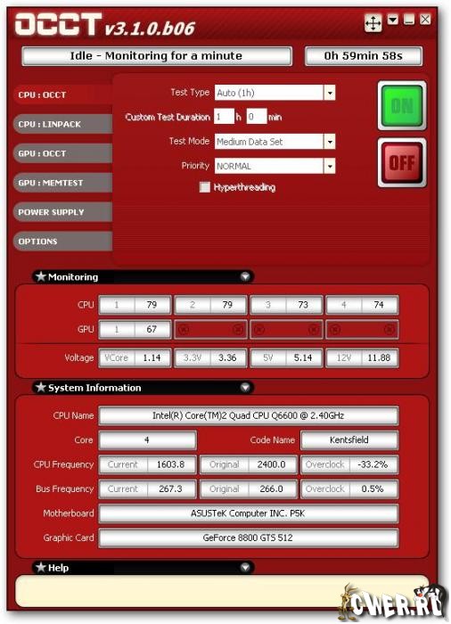 OCCT (OverClock Checking Tool) - тест стабильности системы представляет собой более красочный аналог известного Prime с возможностью проверки подсистемы памяти и отдельно процессора с функциями мониторинга и выводе детальных графиков по всем контролируемым пунктам. Считывание показателей материнских плат и процессоров обеспечивается за счет взаимодействия с известными программными решениями подобного класса, а именно MotherBoard Monitor, SpeedFan и Lavalys Everest.