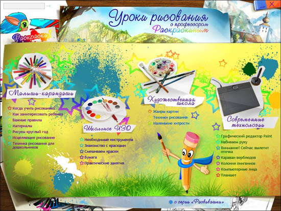 Этот программа расскажет о различных методиках обучения рисованию, ответит на вопрос, в каком возрасте и с чего начинать знакомство с изобразительным искусством. Ваш ребенок начнет с простейших рисунков и постепенно разовьет и усовершенствует свои навыки. Для подростков, уже знакомых с азами изобразительного искусства, представлены инструкции по созданию картин, дается подробное описание различных жанров живописи. Ребята узнают, что такое коллаж, трафарет, шарж и многое другое. Кроме того, на диске содержится пошаговое описание процесса изображения самых разных зверей на бумаге: от домашних до диких. Здесь же можно найти советы по работе с компьютерными графическими программами: простейшим Paint и профессиональными Corel Painter и Photoshop.