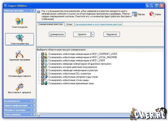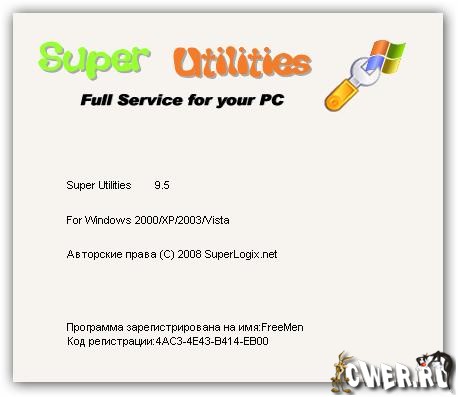 Super Utilities - это набор полезных утилит, имеющий в своем арсенале 29 инструментов, при помощи которых вы сможете наладить, очистить и ускорить работу своей операционной системы. Входящие в состав этого пакета компоненты, в свою очередь разбиты на четыре набора: утилиты для очистки системы, эксплуатации, защиты компьютера и данных, а так же дополнительный набор специальных утилит. Модуль очистки (System Cleaner) содержит компонент для удаления вредоносных программ, а так же инструменты для очистки жесткого диска, реестра и т.д. Security Doctor поможет вам обнаружить, удалить и защитить ваш компьютер от множества вредоносных программ, рекламных модулей, троянов, кейлоггеров.