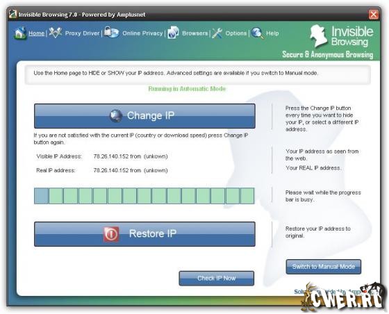 Invisible Browsing - программа, с помощью которой Вы сможете скрывать, изменять и маскировать свой IP адрес. Данная программа позволяет Вам анонимно блуждать по Интернету, предотвращая запись Вашего IP адреса или другой информации без Вашего разрешения, позволяет Вам изменять свой IP в любое время, поэтому Вы сможете направлять свой Интернет трафик в заморские серверы. Все модули доступа заранее протестированы, обеспечивая Вам высокоскоростное анонимное Интернет соединение. Invisible Browsing обеспечивает Вам конфиденциальность в режиме реального времени, постоянно удаляя такие Ваши следы, как пароли браузера, историю Интернет URL, напечатанную URL историю, авто заполненные формы и историю паролей, Избранное в Internet Explore и временные файлы.