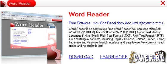 Word Reader - простая программа для просмотра текстовых документов. Она очень пригодится, когда нужно открыть какой то документ, а программного обеспечения, поддерживающего нужный формат на компьютере не установлено. Word Reader без проблем откроет файлы MicroSoft Word 2007 (*.DOCX), MicroSoft Word 97-2003(*.DOC), Hyper Text Markup Language (*.Htm,*.Html), Plain Text Format (*.TXT), Rich Text Format (*.RTF).
