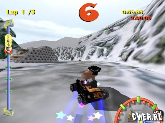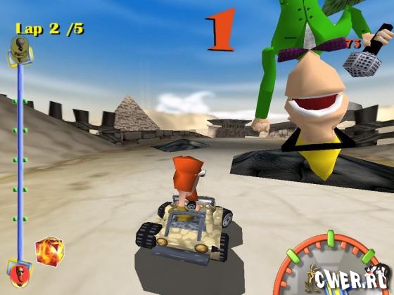 Чтобы прийти к финишу первым, надо хорошо водить. И хорошо стрелять. А также хорошо прыгать по трамплинам, хорошо огибать падающие валуны и хорошо объезжать подброшенные соперниками мины. По трассам разбросаны бонусы, только успевай подбирать. Можно пальнуть ракетой в лидера гонки, а можно заполучить небольшое дождевое облако — на радость идущим сзади машинам. Надоест гонять по пустыне — можно поноситься по средневековому замку или заехать в казино. Для особых ценителей есть даже трассы на Луне и Венере.