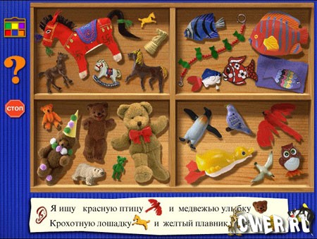 Основу игры составляют рифмованные картинки-загадки, для отгадывания которых необходимо найти на экране все перечисленные предметы. Не беда, если ребёнок ещё не умеет читать - все надписи в загадках снабжены маленькими изображениями вещей, которые надо найти, а чтобы услышать их название, достаточно щёлкнуть надпись. Темы игр близки и понятны малышу: "Городок из деревянных кубиков", "Ящик с игрушками" и "Природа". Иногда придётся хорошенько подумать, например, когда в загадке говорится: "Ищу трёх овечек рядком", - а на картинке рядом стоят только две овечки. Надо догадаться, что третью овечку можно перетащить к первым двум. Или в "Ящике с игрушками" столько разных игрушек, что для того, чтобы найти то, о чём спрашивается в загадке, хорошо бы сначала понять, в каком отделении ящика искать. Значит, малыш должен сообразить, по какому принципу рассортированы игрушки. Ну, а предметы в "Природе" можно разглядеть, только воспользовавшись специальной лупой.