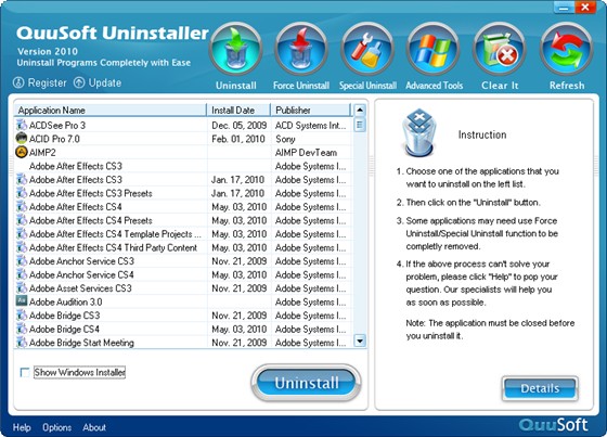 QuuSoft Uninstaller - комплексное решение для быстрого и тщательного удаления любых проиложений, а также оставшихся после деинсталляции программ файлов, папок и ключей реестра.