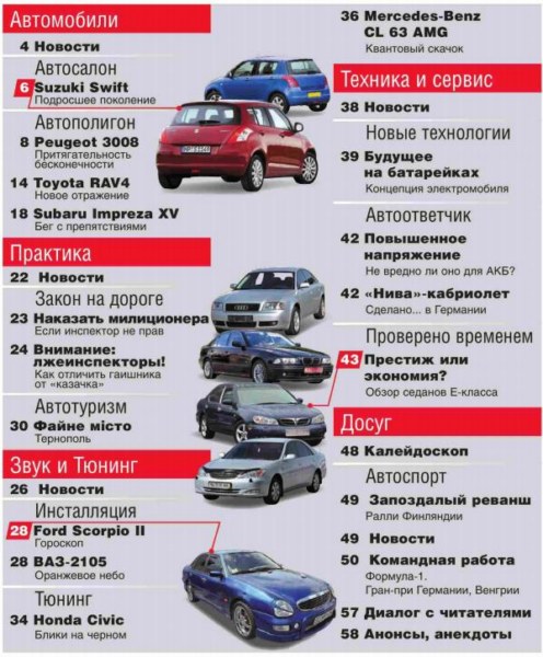Еженедельное издание, полностью посвященное миру автомобилей. В издании представлено максимум информации о автомобилях и не только. Основные рубрики журнала: Автосалон, Автополигон, Концепции, Авторынок, Автобизнес, События и выставки, Практические технические и юридические советы, Спорт и другое.