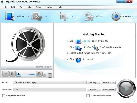 Bigasoft Total Video Converter - поможет вам конвертировать видео, аудио, видео в аудио, а также обрезать, изменять размер видео, соединять видео файлы, разделять их и т.д. Программа поддерживает конвертацию следующих форматов: AVI, Xvid, DivX, H.264, MP4, 3GP, MKV, WMV, RM, FLV, MOV, WebM, WTV, MP3, AAC, AC3, WAV, WMA, FLAC, Apple Lossless, AIFF, APE, и т.д.