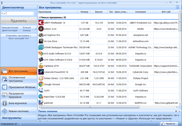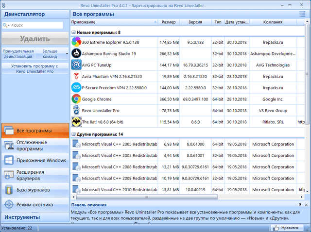 Программа для удаления нежелательных приложений, установленных на вашем компьютере. Revo Uninstaller имеет продвинутый алгоритм сканирования системы до и после инсталляции и позволяет удалять оставшиеся после деинсталляции программы файлы, папки и ключи реестра. Уникальный "режим охотника" предлагает простые, но эффективные инструменты для управления (деинсталляция, остановка, удаление, отмена автозапуска) и получения информации об инсталлированных и/или запущенных программах. Revo Uninstaller также предлагает еще 8 различных утилит для очистки системы.