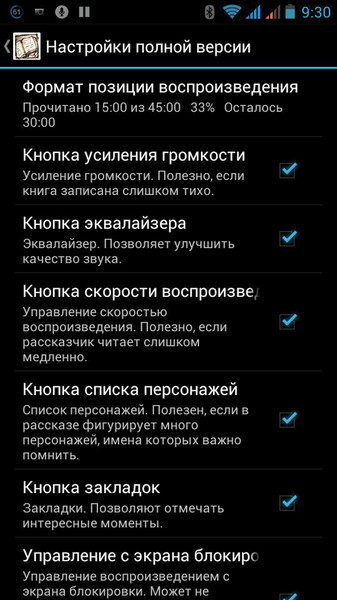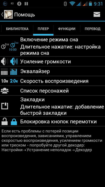 В возможностях программы позабыли указать "Управление скоростью воспроизведения" (частенько без ускорения некомфортно слушать Вячеслава Герасимова) и "Загрузки обложек книг с интернета". Известные проблемы с Bluetooth — гарнитурой решаются через смену декодера в "настройки-устранение неполадок")
