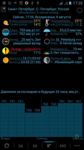 - 10 индикаторов в строке статуса:температура, осадки, барометр, ветер и так далее..