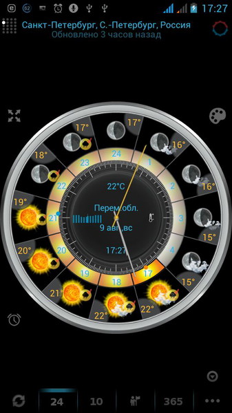 - Почасовой прогноз на 24 часа в виде аналоговых часов.