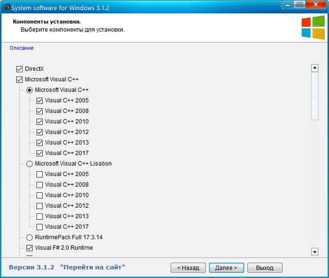 • RuntimePack Full включает в себя RuntimePack Lite и библиотек Microsoft Visual C++ 2005-2013.