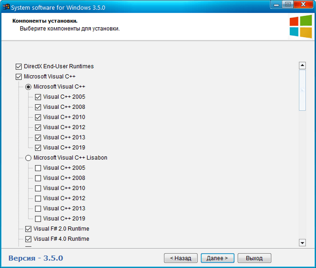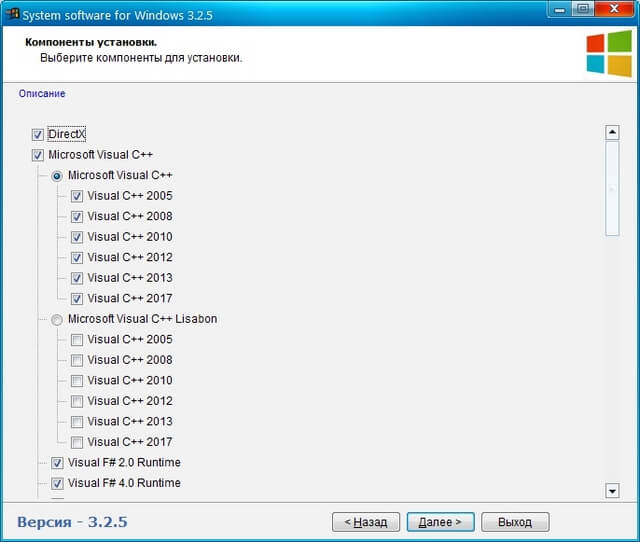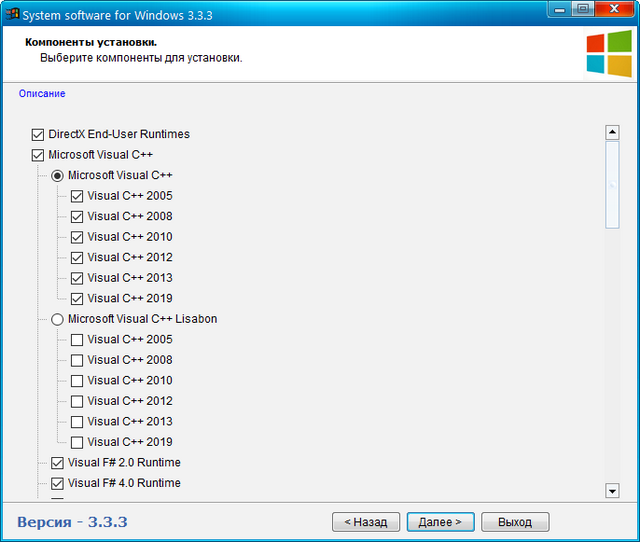 • Microsoft Visual С++ (2005-2008-2010-2012-2013-2019-2022-2026 x86 и x64 + Visual Studio 2010 F# Runtime 2.0 + F# Runtime 4.0 + Visual Basic 6.0 Runtime Plus 2.2 + Visual J# 2.0 Redistributable Package + Visual Basic 7 Runtime)