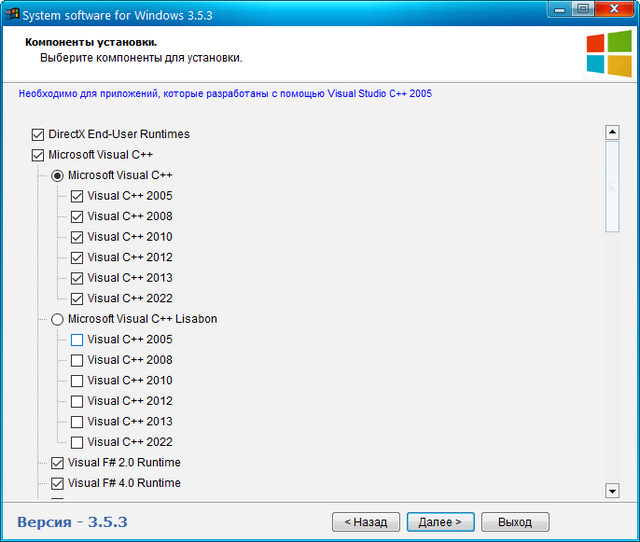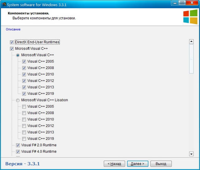 - Microsoft Visual С++ (2005-2008-2010-2012-2013-2019-2022-2026 x86 и x64 + Visual Studio 2010 F# Runtime 2.0 + F# Runtime 4.0 + Visual Basic 6.0 Runtime Plus 2.2 + Visual J# 2.0 Redistributable Package + Visual Basic 7 Runtime)