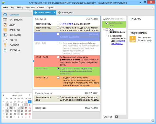 EssentialPIM - высокофункциональный менеджер персональной информации с продуманным интерфейсом и множеством возможностей. Содержит средства для работы с календарем, списком задач, заметками и контактами. Есть широкие возможности для печати, импорта и экспорта информации, возможность запуска с переносных USB накопителей (включая U3 SmartDrive - сертифицированную версию), синхронизация с карманными компьютерами и смартфонами работающими под управлением WindowsMobile, PalmOS. Поддерживается 128-битное шифрование, экспорт/импорт данных из MS Outlook, Windows Address Book, расширенный поиск, различные опции печати. Также включает в себя инструмент для хранения контактов с неограниченным количеством полей.