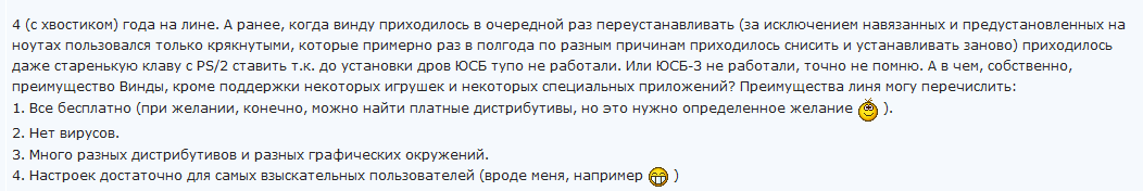 При беседах с линуксойдами будьте крайне и предельно осторожны. Эти товарищи могут перейти с конструктивного холивара на неконструктивную войну - кто быстрее пожалуется администрации и позовет на помощь или какому-то еще подобному приему. Не лезьте в эти проповеди- даже их не читайте. Иначе потом будете долго расхлебывать последствия неспортивного их поведения.