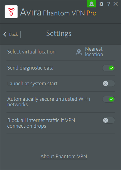 - В меню настроек пользователь может беспроблемно изменить страну VPN сервера и настроить передачу диагностических данных в Avira. Кроме того, можно настроить автоматический запуск службы при старте системы.