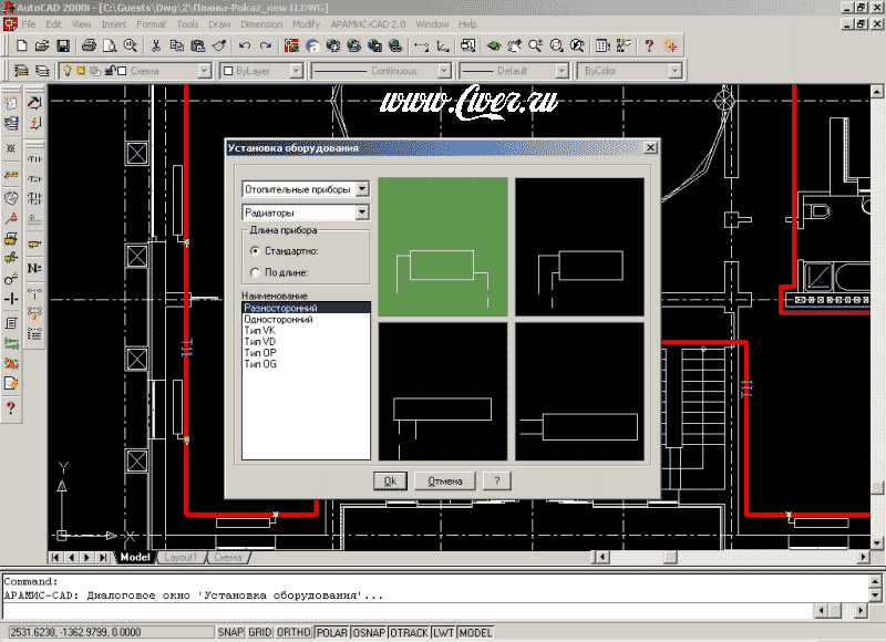 Установка оборудования позволяет вставлять любые элементы системы отопления, отопительные приборы (радиаторы, конвекторы, регистры ...). Для этого выберите необходимые класс и тип оборудования из предложенного списка, а также сам прибор.