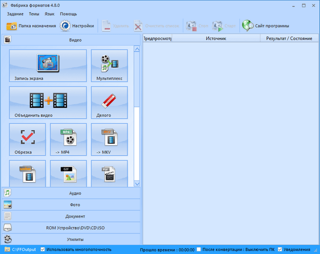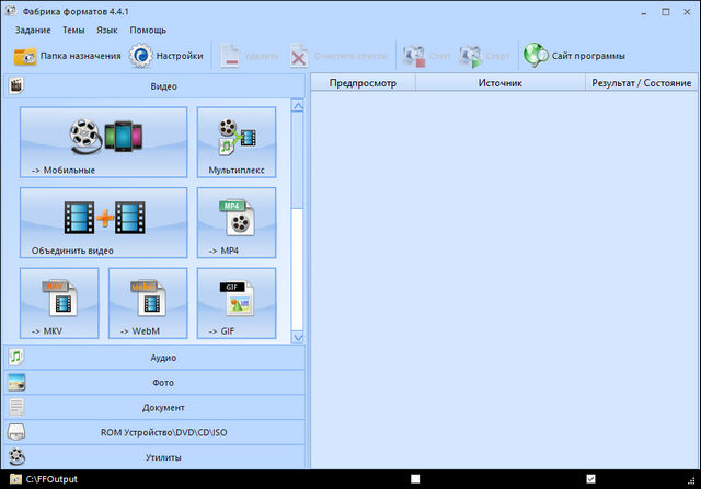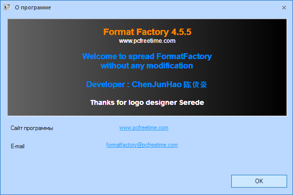 FormatFactory - многофункциональный конвертер различных файлов мультимедиа. Имеет ряд дополнительных функций, превращающих FormatFactory в универсальный инструмент для работы с мультимедийными файлами разных форматов. Поддерживается конвертация популярных видеоформатов в MP4, 3GP, MPG, AVI, WMV, FLV, SWF, а также конвертация аудиоформатов в MP3, WMA, MMF, AMR, OGG, M4A, WAV. В FormatFactory есть функция преобразования изображений в форматы JPG, BMP, PNG, TIF, ICO, GIF, PCX, TGA. Среди дополнительных возможностей FormatFactory есть такие, как увеличение и вращение изображений, присвоение им тегов, а также восстановление поврежденных аудио и видеофайлов.