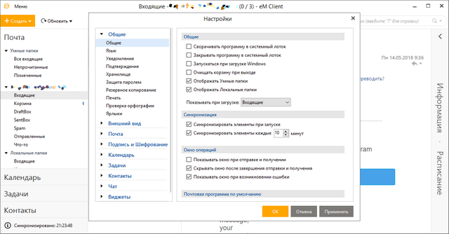 Программа eM Client представляет собой полнофункциональный клиент электронной почты с современным и простым в использовании интерфейсом. Она также предлагает календарь, задачник, контакты и чат. Поддерживает практически все почтовые серверы, а также позволяет импортировать имеющиеся данные из других популярных почтовых программ.