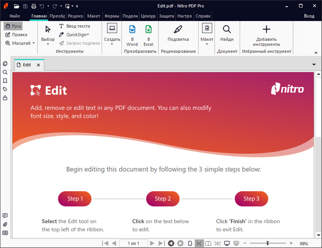 Nitro Pro - мощный набор инструментов для создания и редактирования файлов PDF. Nitro Pro — программа, которая является альтернативой Adobe Acrobat, позволяет выполнять пакетную обработку файлов и сканировать документ напрямую в формат PDF, имеет возможность выполнять объединение нескольких файлов в один, конвертировать документы в PDF из более чем трех сотен различных типов файлов.