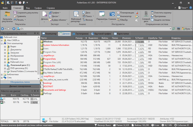 С помощью программы FolderSizes вы сможете определить количество свободного места на жестком диске. FolderSizes предоставляет подробную информацию о размере папок и файлов по каждому разделу жесткого диска. Кроме этого, программа использует диаграммы для наглядности. Используя данный программный продукт, вы сможете найти файлы, удаление которых позволит освободить свободное место и, в то же время, не повлияет на работоспособность операционной системы.