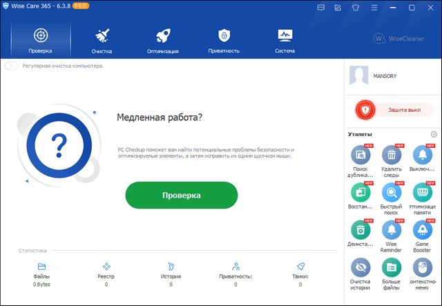 Wise Care 365 – программный пакет, предназначенный для оптимизации, настройки и очистки компьютера. Способен быстро и безопасно произвести очистку системного реестра, освободить место на диске, дефрагментировать реестр и жесткий диск, восстановить удаленные файлы, блокировать приложения путем установки пароля на запуск, оптимизировать оперативную память, редактировать список автозагружаемых приложений и многое другое. Имеются дополнительные опции скрытия и шифрования важных файлов или папок, оптимизация компьютера "в один клик" и работа по расписанию.