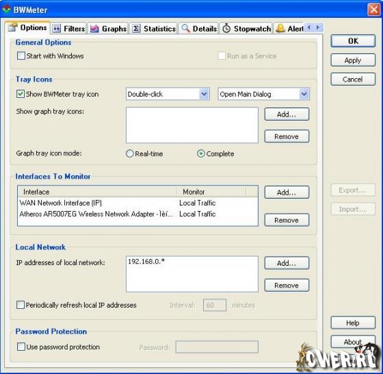 BWMeter 4.3.2 - програма для подсчета трафика и его графического отображения. Допускает раздельный подсчет внутрисетевого и исходящего / входящего интернет-трафика (для этого имеются настраиваемые фильтры). Кроме этого, BWMeter позволяет позволяет производить учет переданных пакетов, причем можно узнать, откуда и куда они направляются, к какому порту и по какому протоколу. Итоги всех этих подсчетов могут выводиться как в как графическом виде, так и в виде обычных цифровых отчетов.