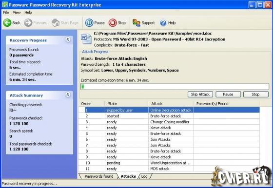 Passware Kit Enterprise - дорогущий ($495) набор инструментов для подбора или определения паролей к файлам ( более 100 видов), созданными самыми известными в мире программами: Office, Excel, Word, Windows XP/2000/NT ,Access, Outlook, Outlook Express, Exchange, WinZip PKZip ZIP, WinRAR RAR, VBA Visual Basic modules, Internet Explorer/ EFS - Encrypted File System, FileMaker/ Acrobat, Quicken, QuickBooks, Lotus 1-2-3, Lotus Notes, Lotus, Organizer, Lotus WordPro, Quattro Pro, Backup, Project, MYOB, Peachtree, Paradox, ACT!, Mail, Schedule+, Money, WordPerfect и MS Office 2007, а также определения ключа Windows XP/2000/NT.