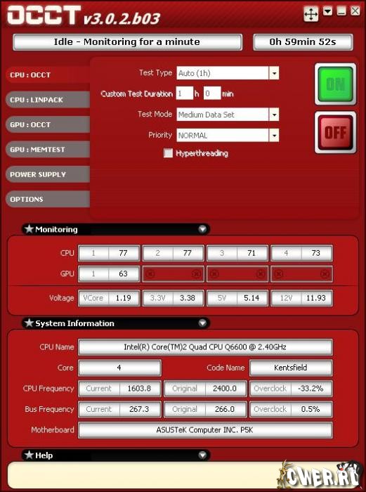 OverClock Checking Tool - тест проверки стабильности работы центрального процессора и оперативной памяти.Результаты проверки выводятся в виде информативных графиков. Поддерживается тестирование современных многоядерных процессоров. В ходе тестов OCCT может выводить рабочие параметры компонентов системы, используя сторонние программы мониторинга - SpeedFan, Everest и т.п.