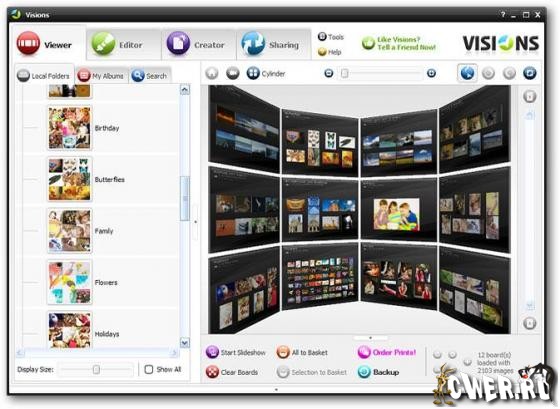 Twins Visions является инновационной системой трехмерного управления изображениями. Она дает возможность перемещаться между папками с изображениями, используя трехмерный интерфейс. Выбранные пользователем папки показываются в несколько рядов, благодаря чему можно одновременно видеть фотографии, размещенные в разных местах жесткого диска. Visions интегрирована с популярным сервисом для обмена фотографиями Flickr и дает возможность загружать на сервис новые фотографии, редактировать информацию об уже имеющихся и скачивать снимки других пользователей. Все это можно делать, не покидая окна Visions. Программа также может похвастаться расширенными функциями поиска, редактором метатегов, наличием большого числа эффектов, возможностями пакетного редактирования изображений.
