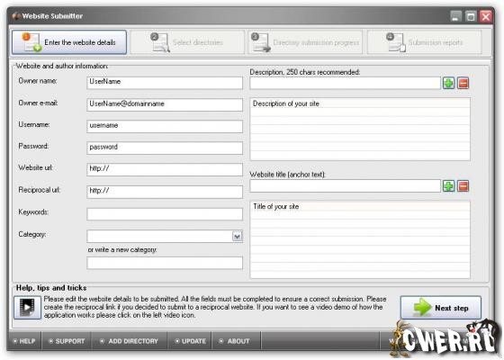 Website Submitter - инструмент для вебмастеров, предназначенный для полуавтоматической публикации вашего сайта в более чем 3500 каталогах и 600 архивах статей, что позволяет повысить рейтинг вашего сайта в поисковых системах. Один из наиболее важных инструментов увеличения ранжирования вашего сайта - это обратные ссылки на вас. Website Submitter помогает получить такие ссылки, автоматически публикуя информацию о вашем сайте в каталогах и поисковых системах. Программа легко и быстро позволяет занести ваш сайт одновременно в несколько каталогов, всегда имеет самые свежие списки поисковых систем и каталогов.
