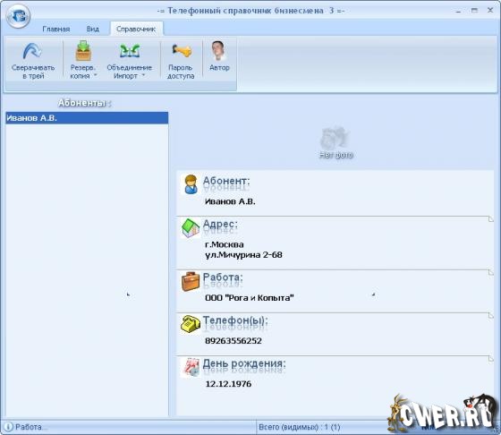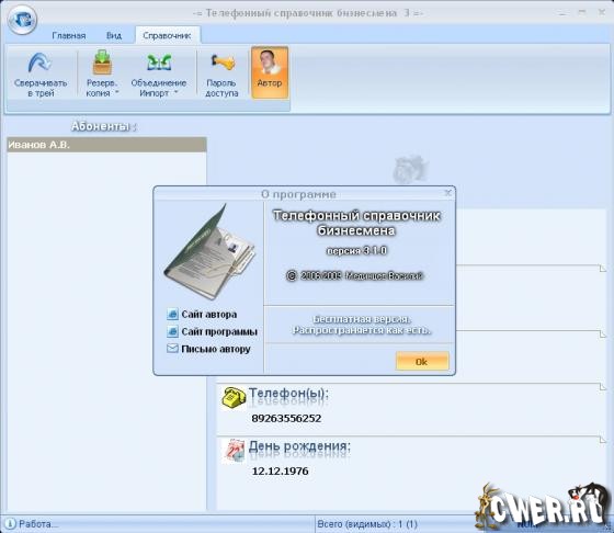 "Телефонный справочник бизнесмена" является оболочкой для управления базой данных телефонов абонентов и другой информацией (всего доступно 7 полей по каждой записи), начиная от имени и заканчивая датой дня рождения.