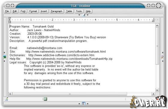 Tomahawk Gold - очень неплохая программа для работы с текстом. Позволяет создавать PDF документы без необходимости установки программ от Adobe. Кроме этого, Tomahawk Gold можно использовать как продвинутый редактор текстовых файлов форматов rtf, txt, tmd(собственный формат) и других. Одной из полезных функций данной программы является возможность конвертации файлов rtf, txt и tmd в формат PDF.
