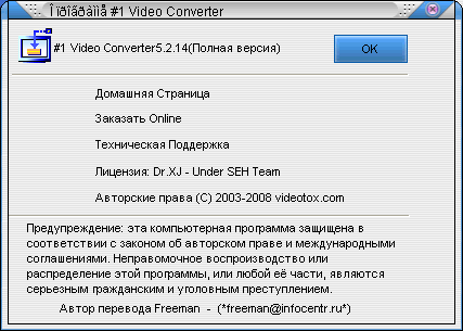 #1 Video Converter - конвертер между популярными видео форматами, извлечение аудио из видео, нарезка и соединение фрагментов. Особенности: конвертер AVI, MPEG1, MPEG2, ASF, WMV, DivX, XviD форматов в MPEG1, MPEG2, VCD, SVCD, DVD, AVI (DivX, XviD, MPEG-4), WMV, ASF форматы, нарезка на фрагменты видео, соединение фрагментов в один файл, предварительный просмотр, настройка начала и конца фрагмента для вырезки, пакетный режим конвертирования, извлечение аудио из видео в MP3, WAV, WMA форматы, извлечение видео в последовательность графических файлов, предварительный просмотр результатов, граббер DVD (VOB и DAT) во все форматы, извлечение аудио из DVD (VOB и DAT) в MP3, WAV, WMA форматы, поддержка PAL и NTSC видео, выбор и настройка кодеков и параметров конвертирования, простой и удобный интерфейс, высокая скорость и высокое качество конвертирования.