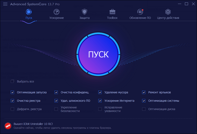 Advanced SystemCare - программный пакет, содержащий множество модулей для оптимизации, настройки и повышения производительности компьютеров, на базе ОС Windows 2000/XP/Vista/7/8/10. Приложение позволяет очистить компьютер от шпионского и рекламного ПО, найти и ликвидировать возможные угрозы и бреши в системе безопасности ОС, исправить ошибки в системном реестре, очистить временные и ненужные файлы, управлять списками автозагрузок, оптимизировать работу ПК.