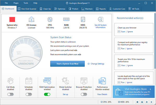 AusLogics BoostSpeed — приложение, которое поможет быстро и качественно произвести настройку ПК на максимальную производительность. Встроенный инструмент System Adviser проверит настройки системы с помощью пятидесяти различных тестов и предложит рекомендации по результатам каждого теста. Программа проверяет систему в режиме реального времени и если находит, что какой-то из параметров можно оптимизировать, то обязательно информирует вас об этом.