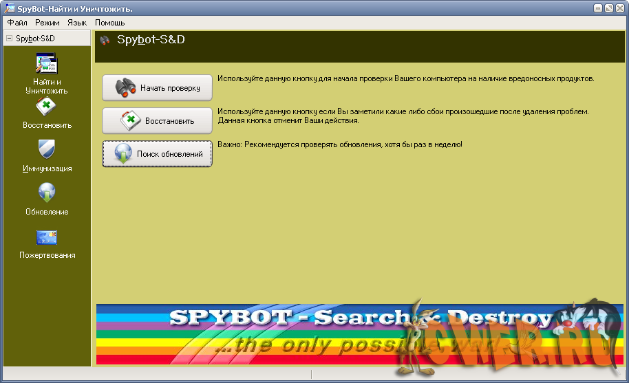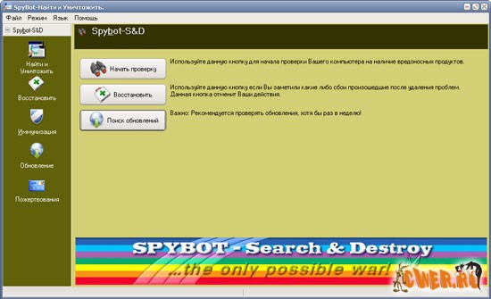 Spybot - Search & Destroy (Спайбот - найти и уничтожить) может обнаруживать и удалять с Вашего компьютера различного рода шпионское программное обеспечение. Шпионское ПО (Spyware) - относительно новый вид угрозы, который еще недостаточно широко обрабатывается стандартными антивирусами. Шпионское ПО молча отслеживает ваше поведение за компьютером, чтобы создать ваш "маркетинговый профиль", который так же молча передается сборщикам информации, продающим ваши данные рекламным организациям. Если Вы видите в Вашем браузере новые панели инструментов, которые Вы явно не устанавливали, если браузер постоянно "падает" или стартовая страница неожиданно изменилась, то вполне вероятно, что в Вашем компьютере завелся "шпион". Но даже если нет ничего необычного, то "шпионы" все равно могут быть - чем дальше, тем больше появляется такого ПО.